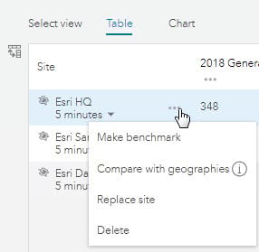 Click on the action icon next to the variable to make a benchmark site, compare with geographies and replace or delete sites.