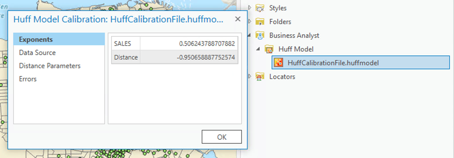 The result of the calibration tool is a file that contains the exponent values for attractiveness variable (e.g. sales) and distance (e.g. driving time).
