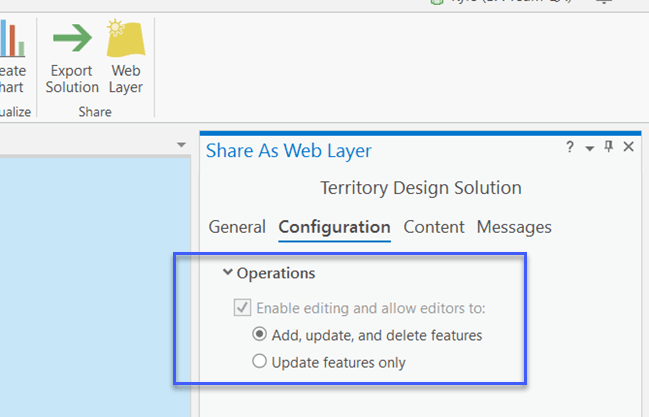 Here I show ArcGIS Pro and a Territory Solution for the Chicago area. I want to share this layer as a web layer to my organization. To do so, in the Territory Design ribbon I click Share > Web Layer.