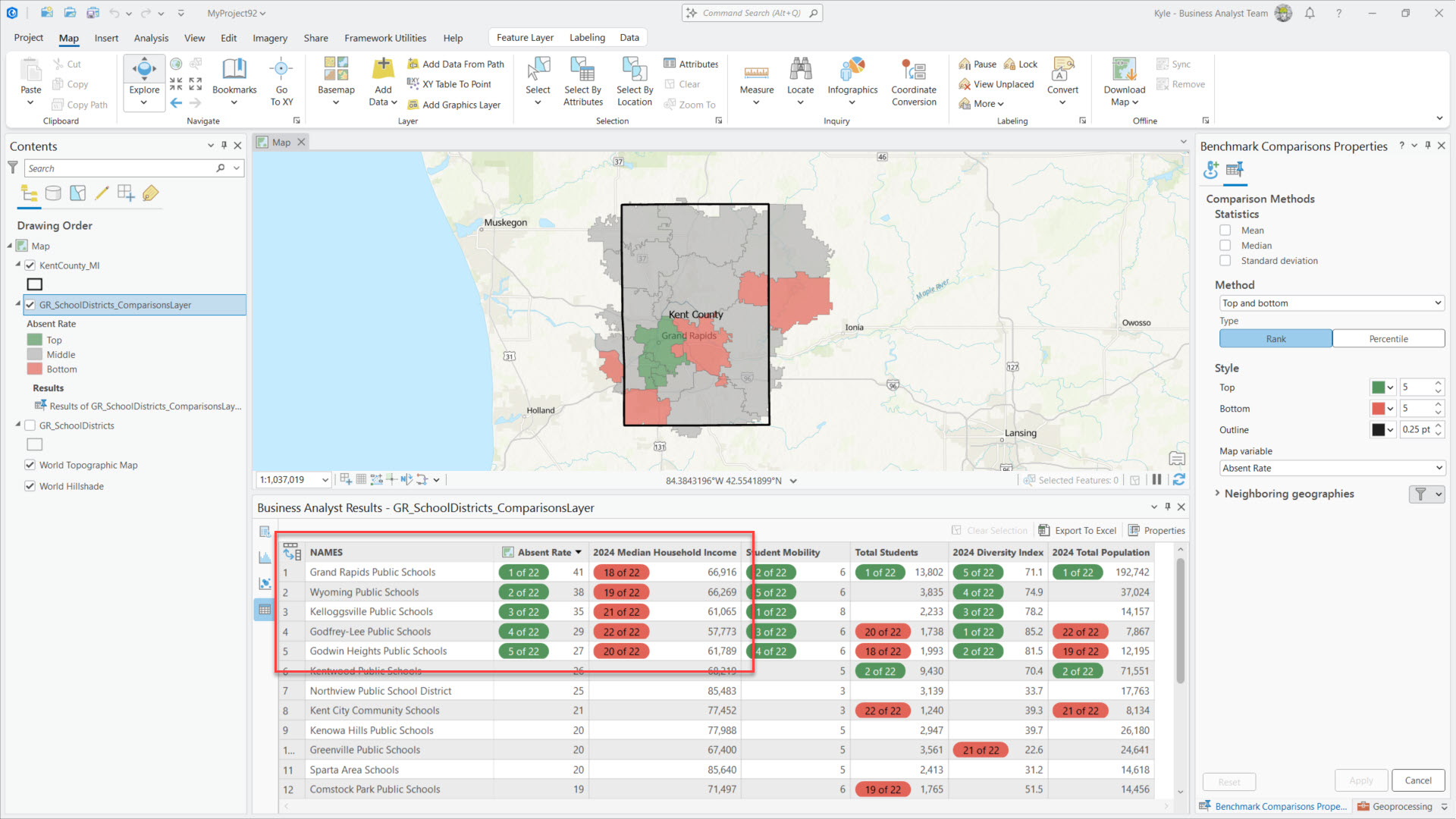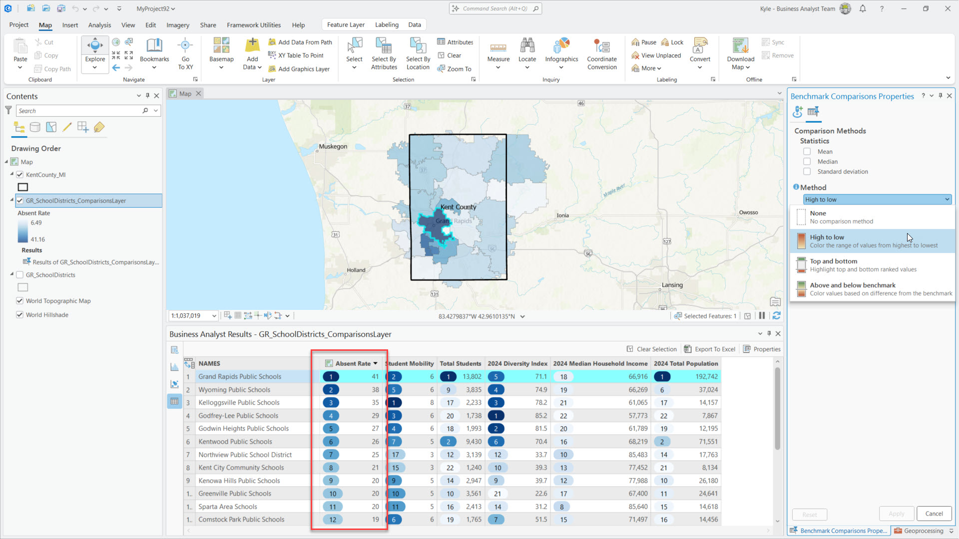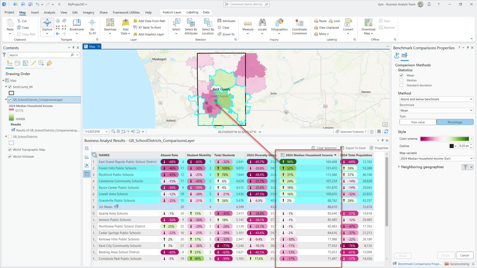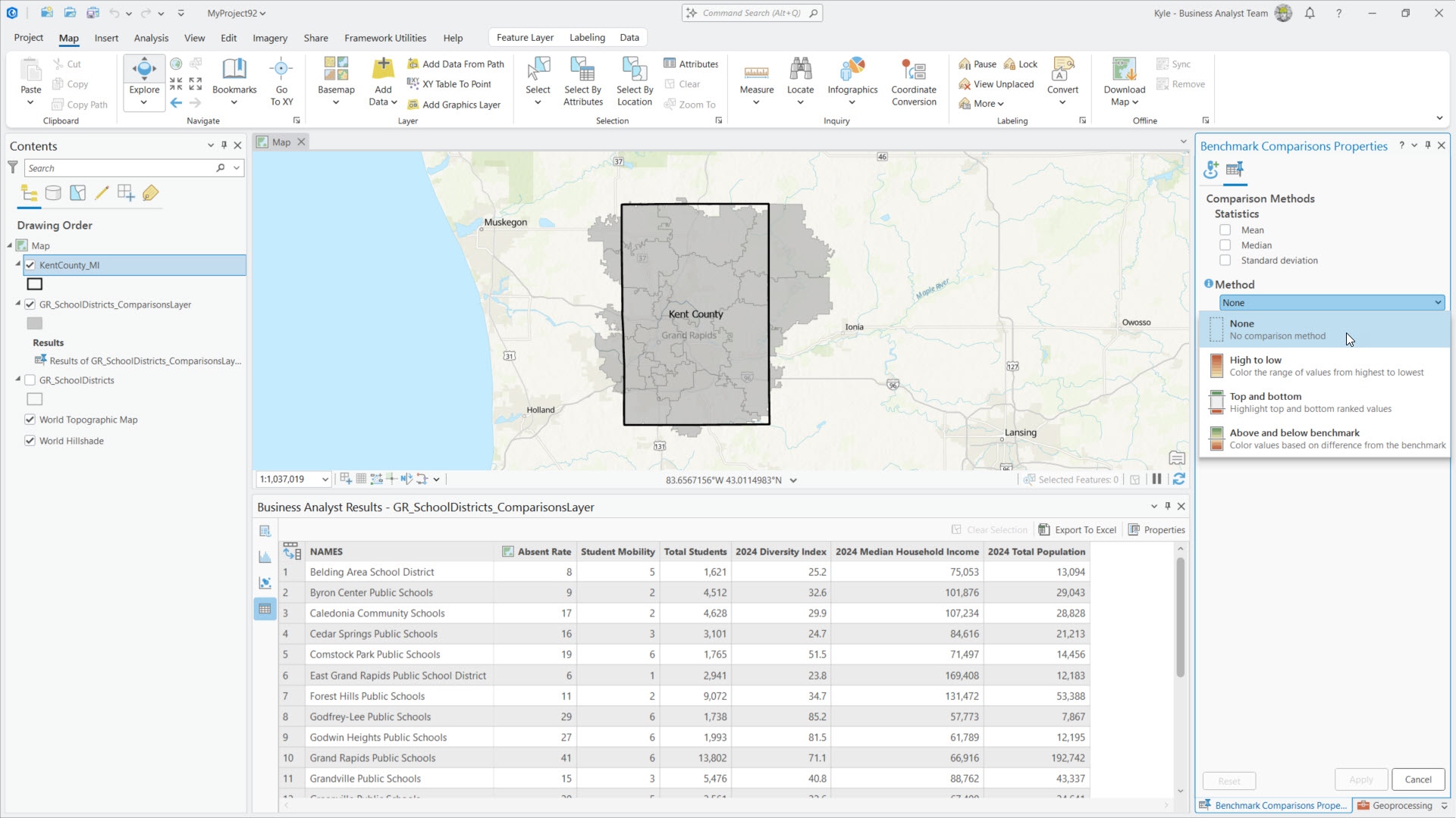 Let’s dive into an example. The image below shows Kent County, Michigan school district boundaries loaded as my sites in a benchmark comparison. I’ve included a combination of demographics (variables) from Esri and school performance markers (site attributes) from MI School Data. Once I’ve got my comparison variables and site attributes in place, I click Apply. Note: There is no data prep magic here, I simply did some manual data entry to add the school metrics from mischooldata.org’s Compare Tool into my districts layer.