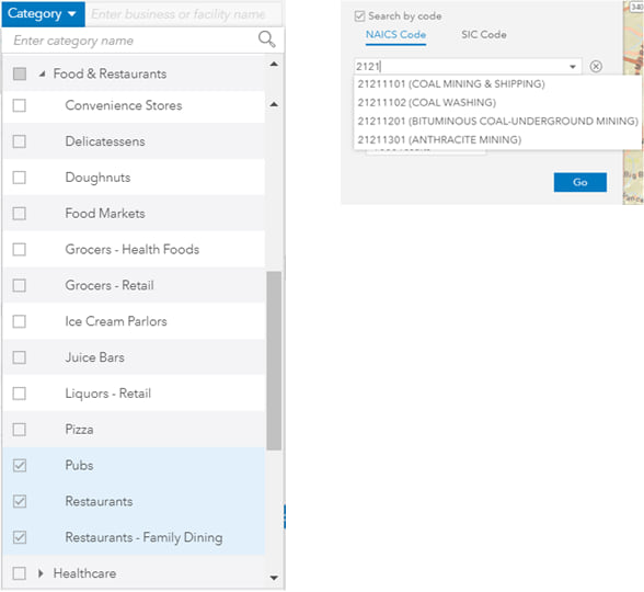 Select categories and/or subcategories within which to perform your business search. For example, if you work for the convention center in your city and need to provide conference attendees a list of things to do, you could select the Entertainment and Recreation categories. Or, say you want to open a new restaurant. Potential competitors would include existing restaurants and pubs, but not establishments with limited options such as delicatessens and pizza places. Instead of performing a generic keyword search for restaurants and going through a long list of results, expand the Food and Restaurants category and select only the Pubs and Restaurants subcategories.