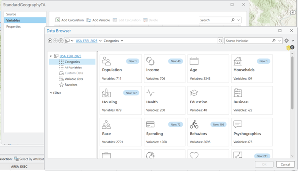 Yes, you can add Esri standard data to a Statistical Data Collection. Standard data are the Business Analyst variables provided by Esri. You can add these variables to, for example, create calculations between your data and the Esri standard data. Perhaps you want to create a calculation using your data and Esri data to return your customer percent penetration.