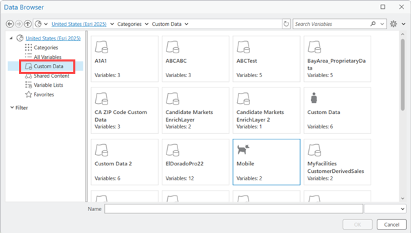 Custom data created in Business Analyst Pro with a local dataset is accessed from the Custom Data node of the data browser.
