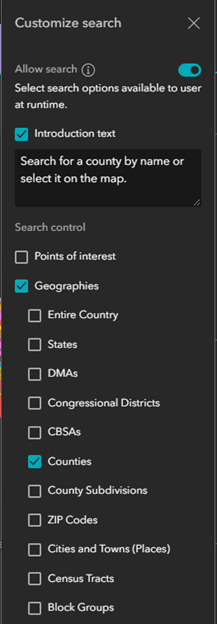 - Uncheck the Point of interest option and only select Counties for the geography search options. Users will be able to search for Counties by name now.