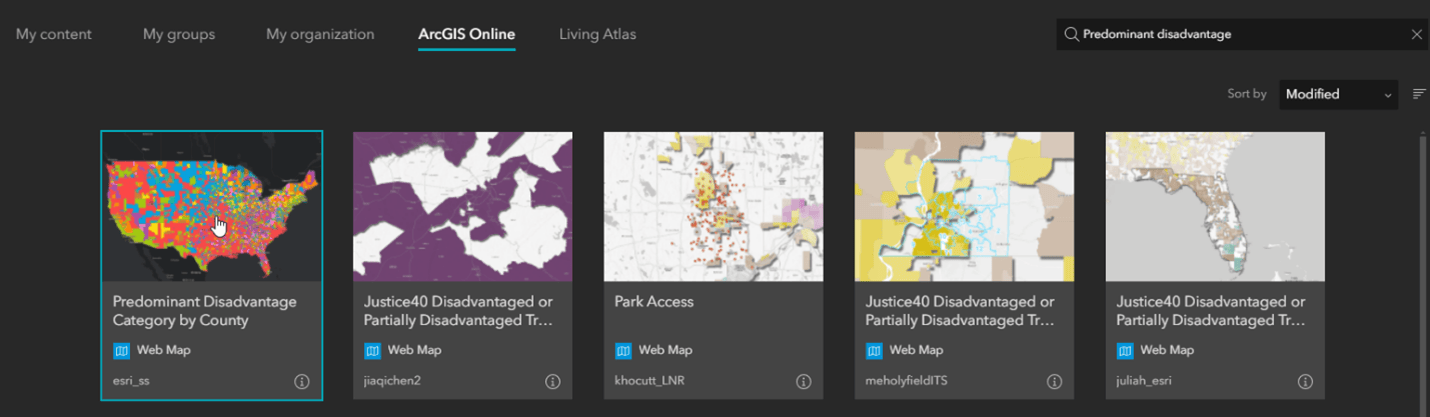 - Click the ArcGIS Online tab and search the keyword “Predominant disadvantage”. Select the “Predominant Disadvantage Category by County” web map from the search results and click Done.