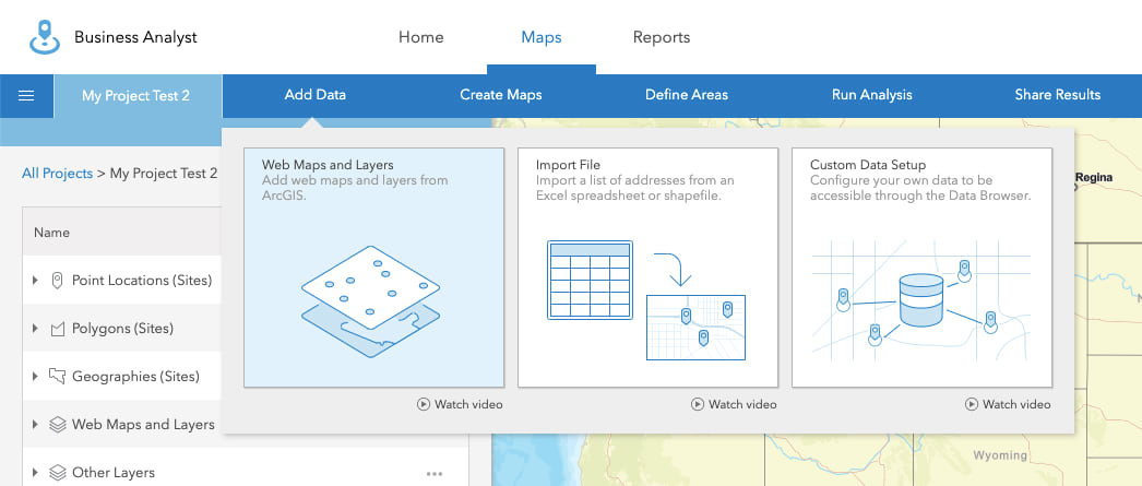 In the Business Analyst Web App, start by browsing the ArcGIS Living Atlas of the World for information about homelessness. To get started, in the top menu select “Add Data” and the “Web Maps and Layers” button: