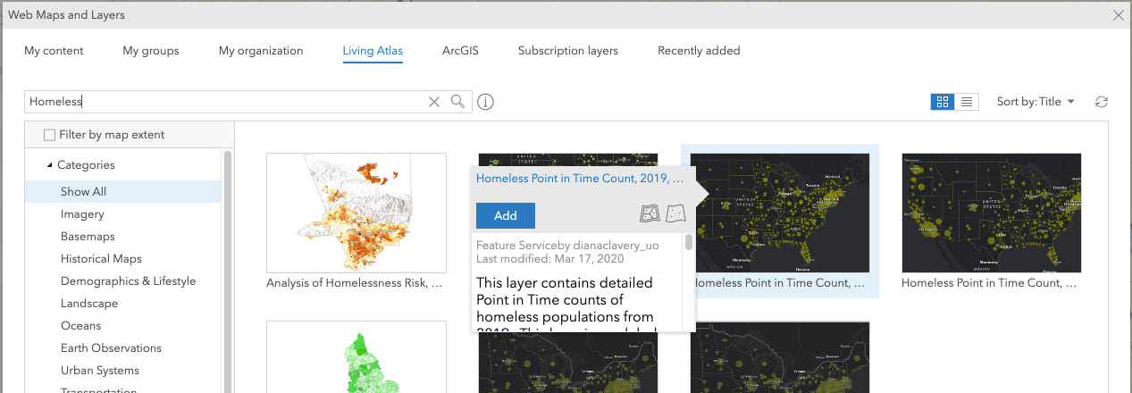Select the “Living Atlas” tab at the top and search for “Homeless”. Hover over the Homeless Point in Time Count, 2019, by Continuum of Care (CoC) Area web map illustrated below and you can read summary information about the layer. Cick “Add” to open: