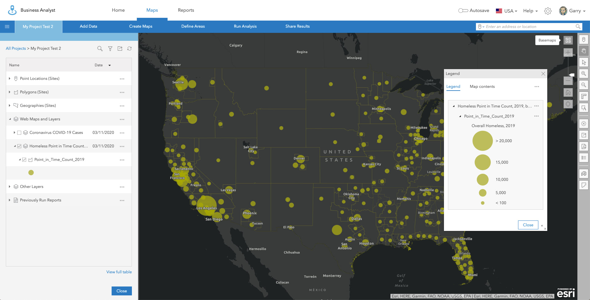 In order to highlight vulnerable populations, we want to examine the number of homeless individuals and the number of people living in shelters. As I noted in my previous blog, information about homeless populations in the Unites States is sparse and information is not tabulated nationally for well known geographies likes Census Tracts or Counties. This example will use the information about the homeless population that is publicly available in the ArcGIS Living Atlas of the World. This layer is derived from the Continuum of Care (CoC) Program. Information about this program can be found on HUD Exchange. The homelessness information is based on a Point-in-Time count that summarizes sheltered and unsheltered homeless persons on a single night in January in 2019.