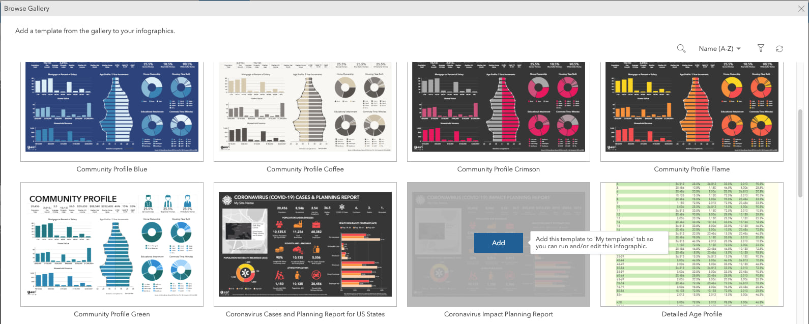 In order to follow the rest of this blog, you will need to add the “Coronavirus Impact Planning Report” infographic template from the gallery. My colleague Helen Thompson’s blog provides a really nice overview of how to do this. In summary: