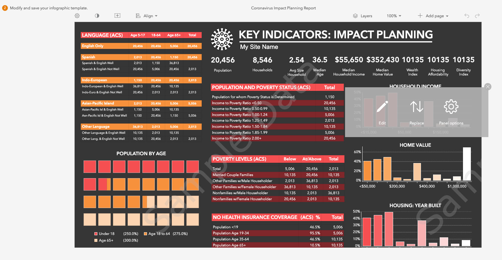 Click “Next” and an infographic panel is created for you. You can add icons from a library of shapes included with Business Analyst or add your own icons or images that are associated with each variable. You can edit any of the text and style and color any of the elements as well: