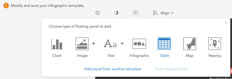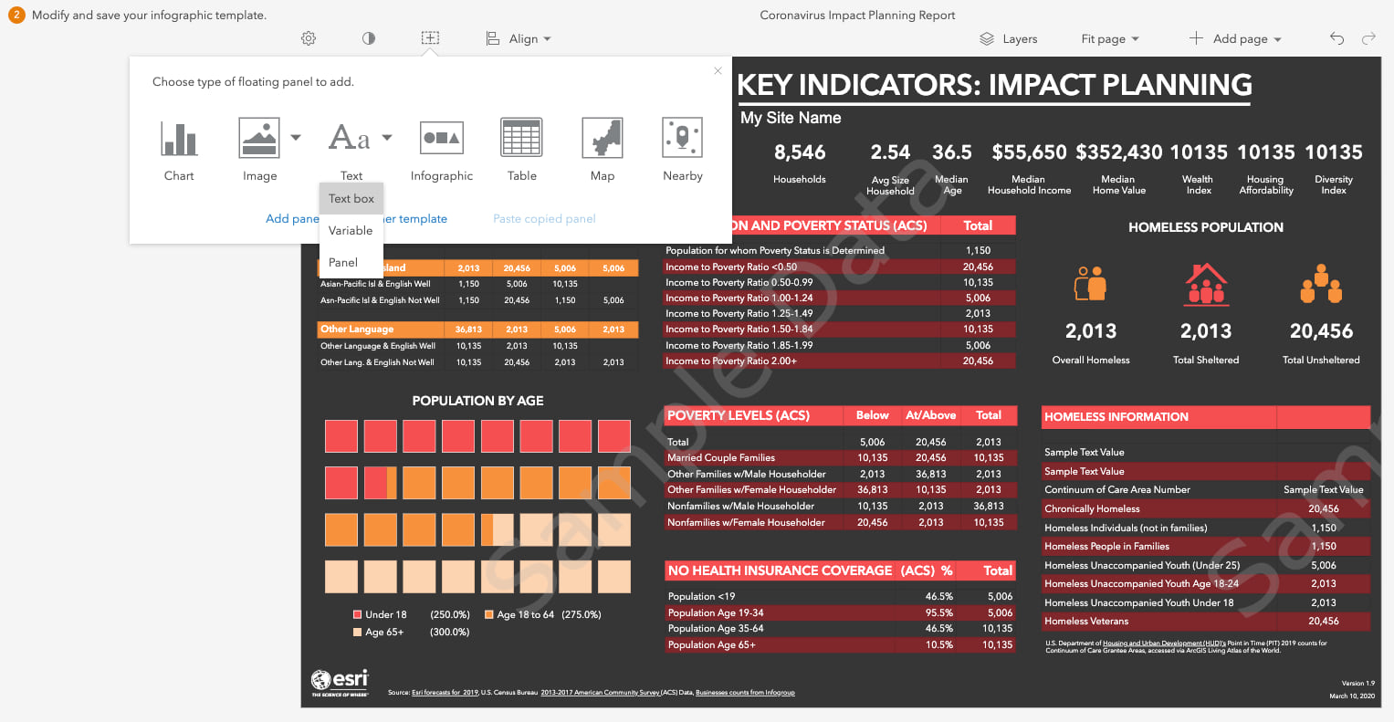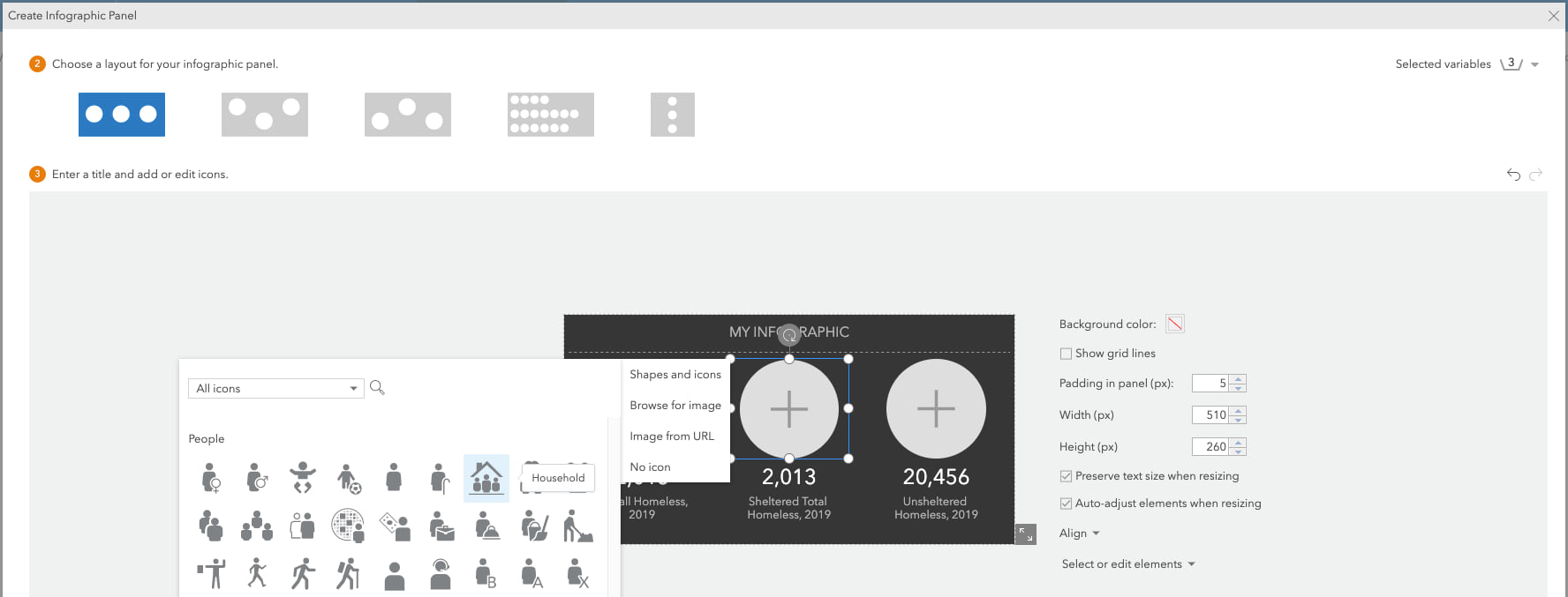 After you add the table, let’s build a nice-looking infographic panel that summarizes the three key indicators within this web map – overall homeless population, homeless population in shelters and the overall unsheltered population. To get started, add another free floating panel at the top and this time select “Infographic”: