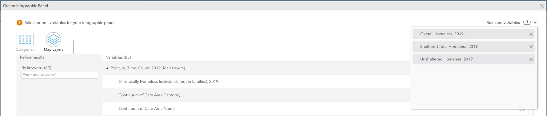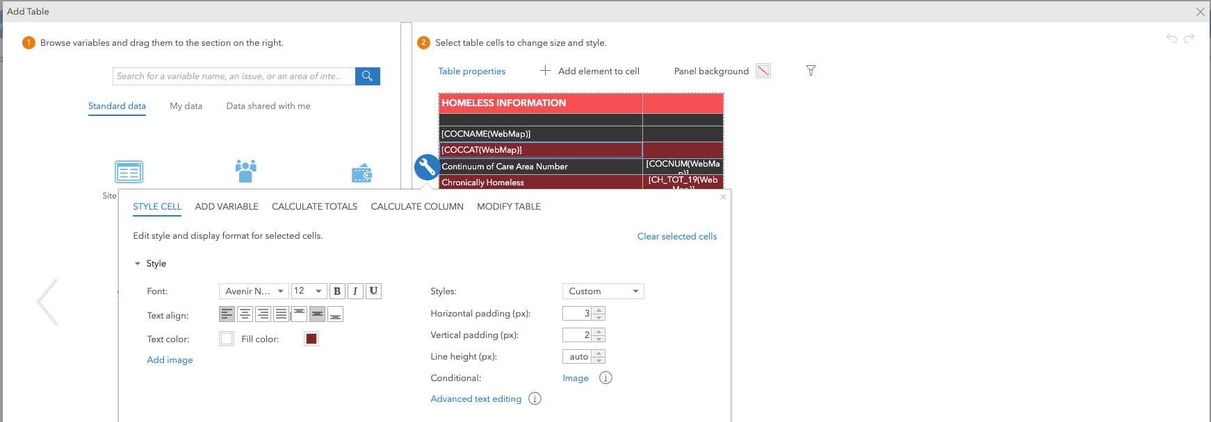 Click the “Table with Variables” button at the top and then select the “Map Layers” category. Find the “Point_in_Time_Count_2019” layer added perviously and select the variables you want to include in the table and click “Apply”:
