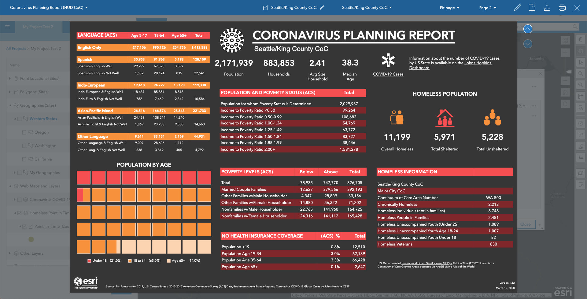 In the “Maps” tab, select any CoC boundary on the map, click the “Infographics” button in the contextual popup and select the new infographic you just created. The second page of the infographic now contains dynamic information about homelessness: