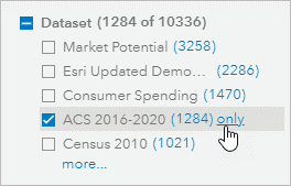 The ACS includes thousands of variables with each release from Census; in the 2016-2020 release it was over 20,000! From this large dataset, variables are chosen for different ArcGIS products to tailor to their slightly differing user bases, although there can be some overlap between products.