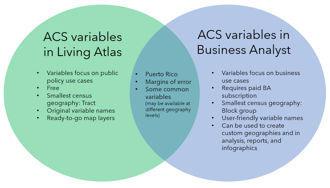 Variables chosen for Business Analyst (also known as BA) have traditionally had a more business-focused audience, while the variables selected for Living Atlas have been more public policy-oriented. Our long-term goal is to make ACS data offerings seamless through the ArcGIS ecosystem, so look for improvements in consistency over time.