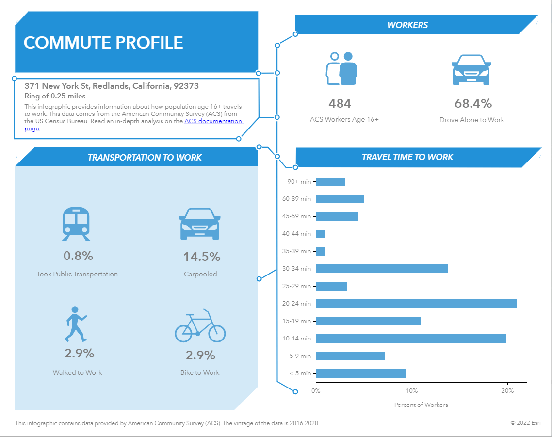 ACS data in Business Analyst can be used in more complex workflows, such as analyzing ACS data within drive-time areas or to build reports and infographics. For example, say you want to look at ACS data regarding commuting patterns within a 0.25-mile radius of Esri Headquarters. You can generate the statistics and view the data in Business Analyst’s Commute Profile infographic: