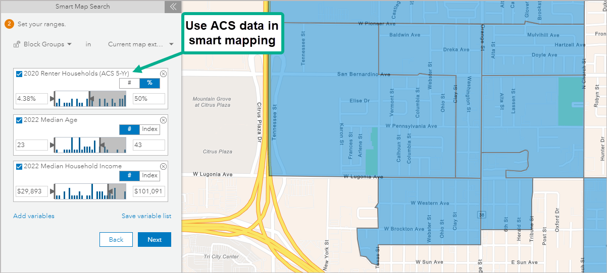 In Business Analyst, ACS data can also be used in workflows such as Smart Map Search and creating threshold areas.