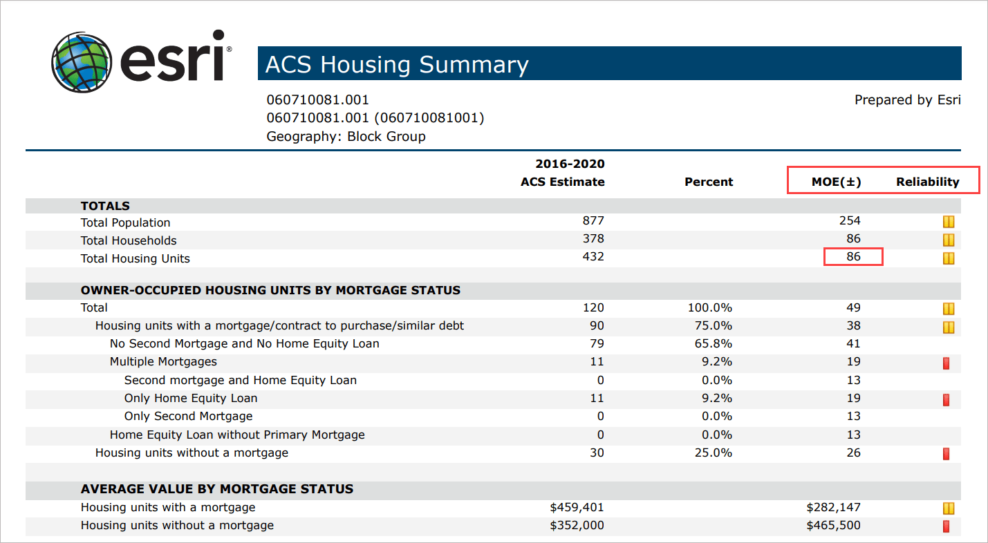 For an extended discussion of the reliability score, see 2016-2020 American Community Survey: Esri Methodology Statement.