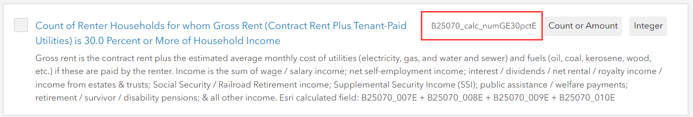 In Living Atlas, these calculations include pre-calculated percentages, ratios, and totals. These can be identified from the field name containing the string “_calc_” in it. Below is an example where Living Atlas has calculated the number of renters paying over 30% of their household income toward rent. The variables used in the custom calculation are shown in the metadata.