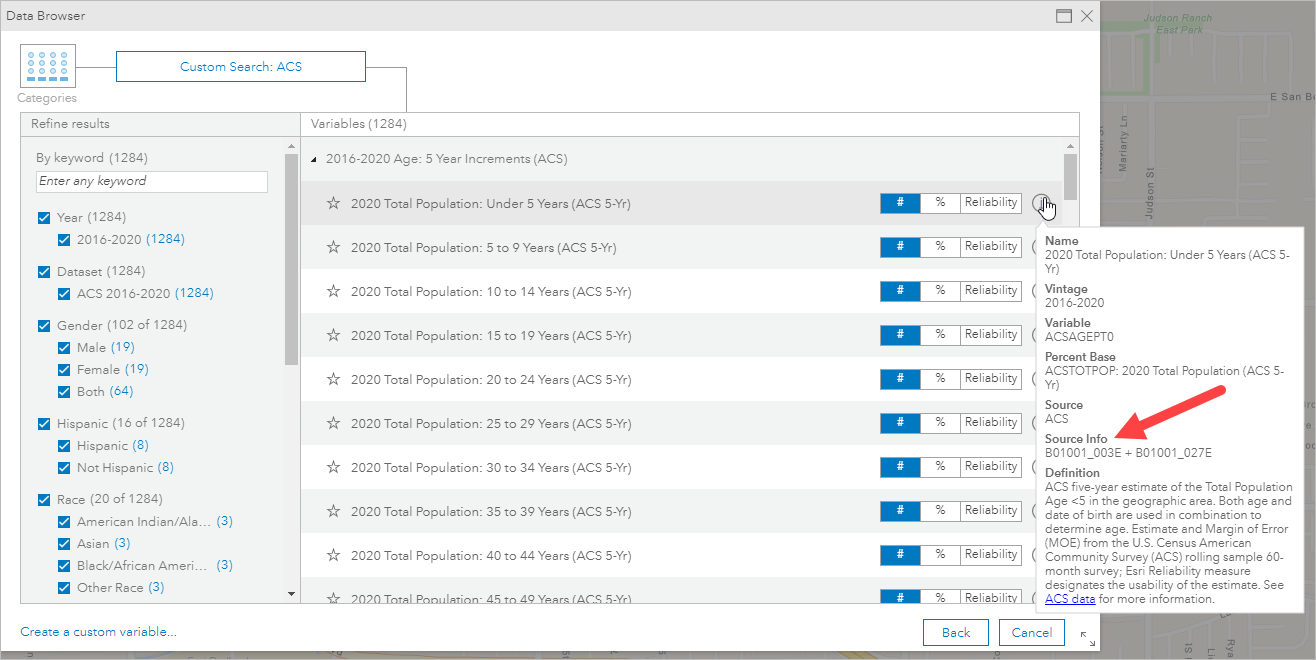 An example of an Esri-calculated variable in Business Analyst is shown below: Total Population Under 5 Years, which combines males under 5 Years of age + females under 5 years of age. In Business Analyst, the ACS variables used to create the calculated value can be seen in the data browser under the Source Info section. There are other Esri calculated variables available as well, such as average values – for example, Average Household Income.