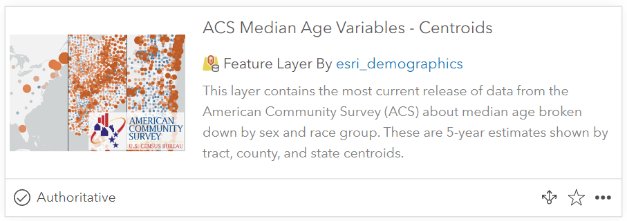 - For an excellent overview of ACS layers hosted in Living Atlas, see American Community Survey (ACS) Hosted Feature Layers FAQ, which also contains dozens of links to blog articles and tutorials on ACS data.