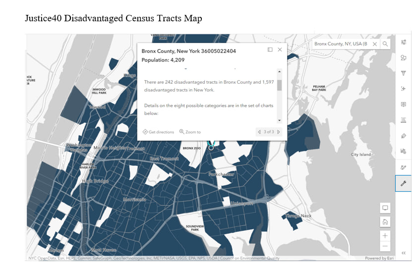 This web map of Esri’s Justice40 feature layer provides additional information for each of these communities based on the categories of disadvantage. For example, in Bronx County, 242 communities are identified as disadvantaged in terms of affordable and sustainable housing, training and workforce development, reduction and remediation of legacy pollution, clean transit, and health burdens, highlighting the areas where federal investments could reduce the burden on these communities.