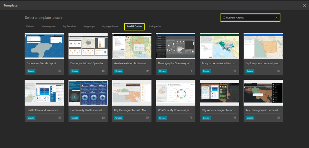There you have it – all the curated templates, ready to be used and customized. Templates created by the Business Analyst team have a Created by ESRI logo.