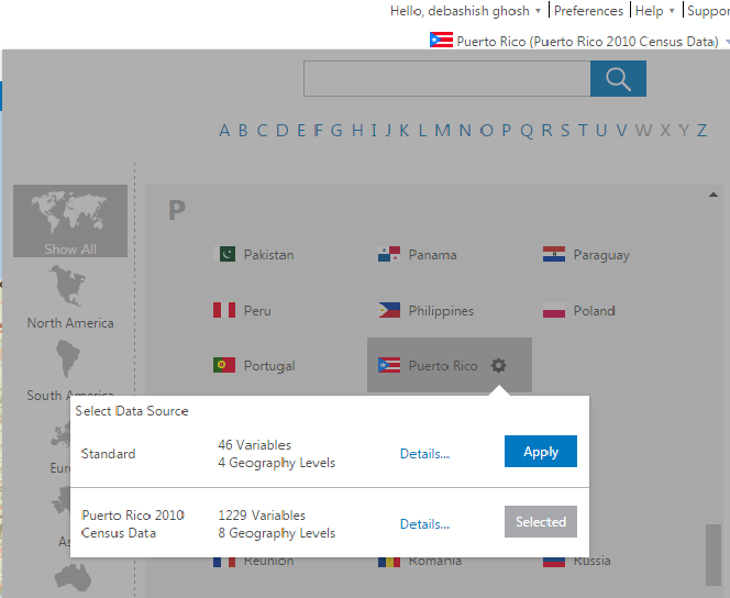 In total there are over 1,200 different variables ranging across several categories from race to age to housing figures, that allow for the generation of optimized authoritative maps, and presentation quality reports. The data exists in 8 different administrative levels, including Block Groups, Census Tracts, Counties and CBSAs. You may explore the full range in the BA Web app. Don’t forget, this new Census Data is in addition to the MBR data that was already available for Puerto Rico. You may switch between these two different datasets via the gear icon for Puerto Rico in the Country selector dropdown.