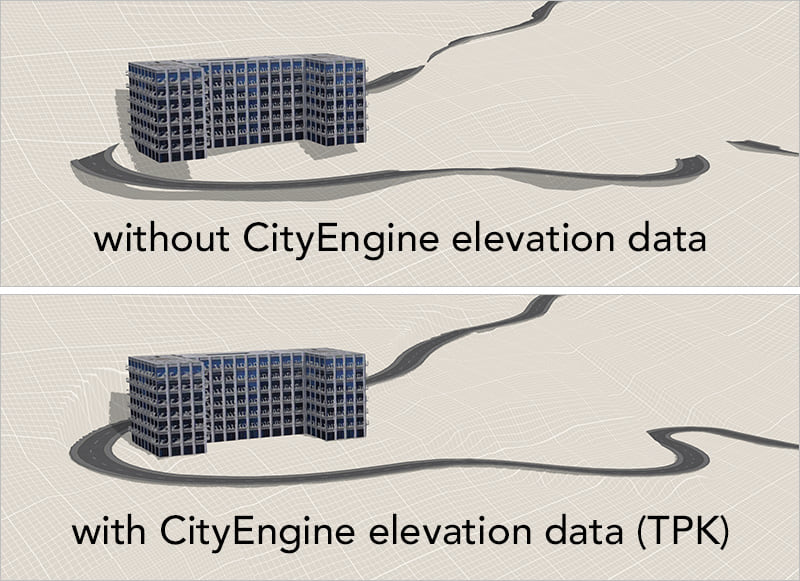 CityEngine now allows you to export a terrain layer as an elevation tile package (TPK, with LERC compression), that you can merge with Esri World Elevation Services in Scene Viewer. For example, local ground modifications caused by new urban development or more detailed street geometry, can be published in web scenes on the ArcGIS platform.