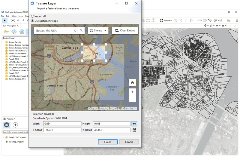 You can now define the working extent of feature layers on the web. This is useful if you have a large layer with hundreds of thousands of polygon features, such as building parcels or footprints, that are too big to load into CityEngine all at once. Therefore, we added a graphical UI where you can work with only a subset of the large feature layer. You can set the extent on a 2D map to import or sync a portion of the large layer. For example, it is possible to select only a neighborhood of interest in a city to import into CityEngine for further urban design and editing workflows. CityEngine maintains a live data connection to the web layer. Therefore, edits in CityEngine can be synchronized with the larger feature layer, allowing for cloud-based or collaborative editing workflows.