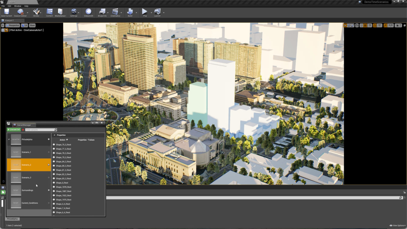 Additionally, the Unreal Engine (Datasmith) exporter now exports CityEngine Scenarios as Unreal Variants, allowing for simple workflows to visualize Scenarios in the Unreal Engine.