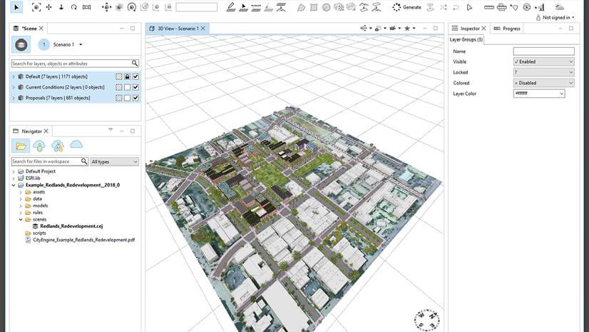 With CityEngine 2021.0, it is now possible to assign Graph, Map, and Terrain layers to Scenarios. This means that complete urban designs, including street networks and terrain modifications, can be handled as different Scenarios. Also, Scenario management now works on layers instead of individual objects, resulting in a more intuitive scenario-based design user experience.