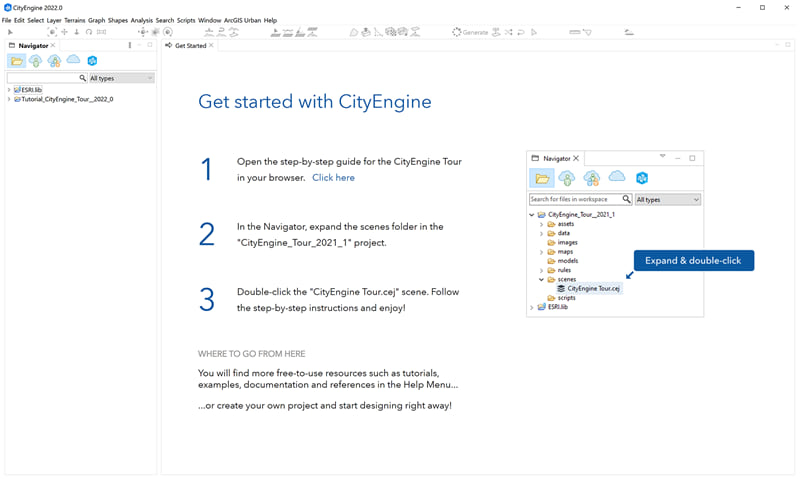 The welcome screen is completely redesigned. It’s now integrated into the UI and can be opened anytime. Furthermore, a new Get Started window appears at start-up, and guides new users through the ArcGIS CityEngine Tour tutorial, which is automatically installed and added to the default workspace.