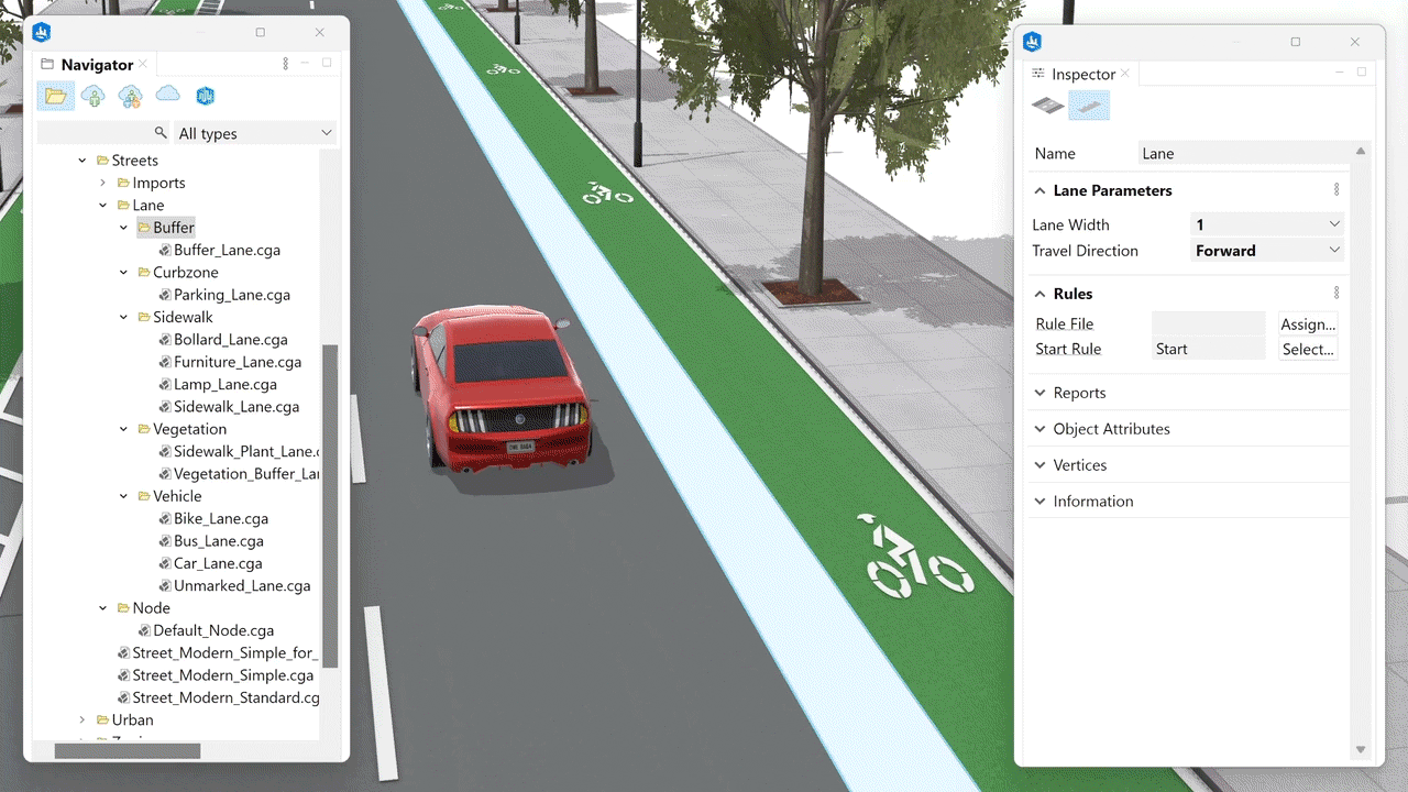 Rules can be applied to “roadbed” or “sidewalk” lanes indistinctly. For example, we could apply a Sidewalk_Lane.cga to a “roadbed” lane to create a pedestrian boulevard in the central part of the street section.