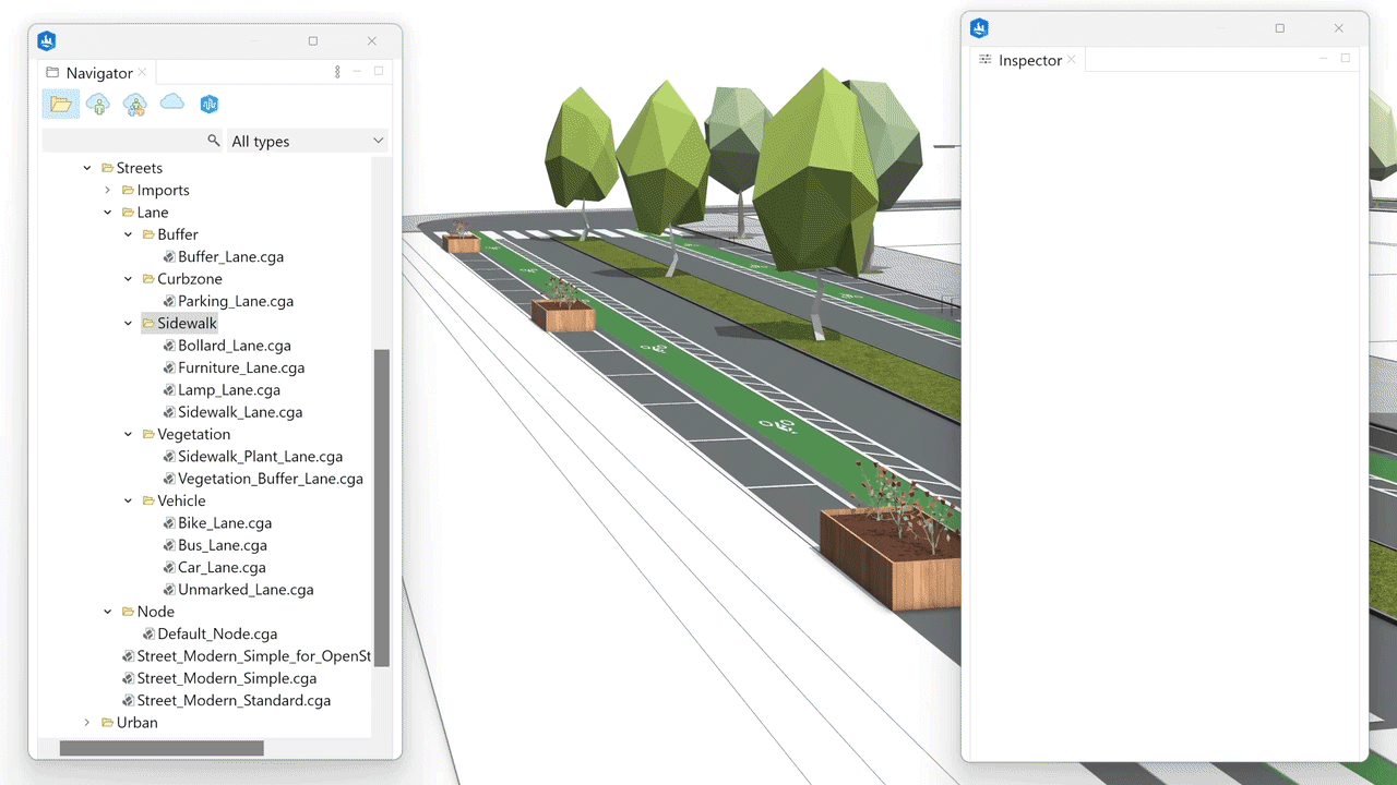 The sidewalk lane rules cover the most common use cases for sidewalks. They include assets like streetlamps, furniture, and bollards. These are all driven by easy-to-set-up attributes that ensure a high level of control over curbs, crossings, and materials.
