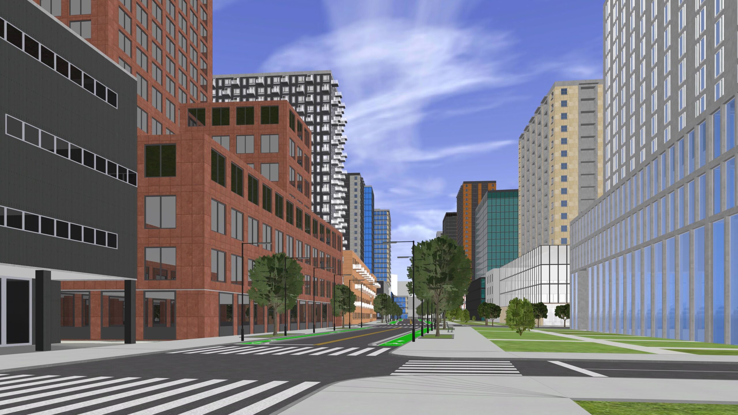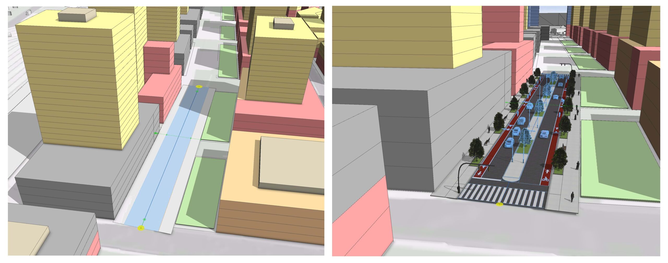 Street networks can easily be created using the Street Creation Tools. Then we recommend that you apply the CGA rule from the “Complete Streets” example project (can be downloaded in CityEngine under “Help – Download Tutorials and Examples”). The rule provides controls to design each type of street in 3D.