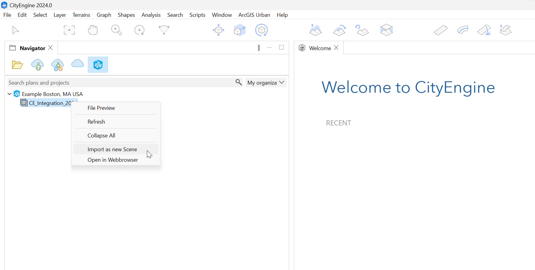 Once logged in to CityEngine, we can connect to the Urban items through the ArcGIS Urban tab in the Navigator window, which displays all the Plans from ArcGIS Urban that you have access to.
