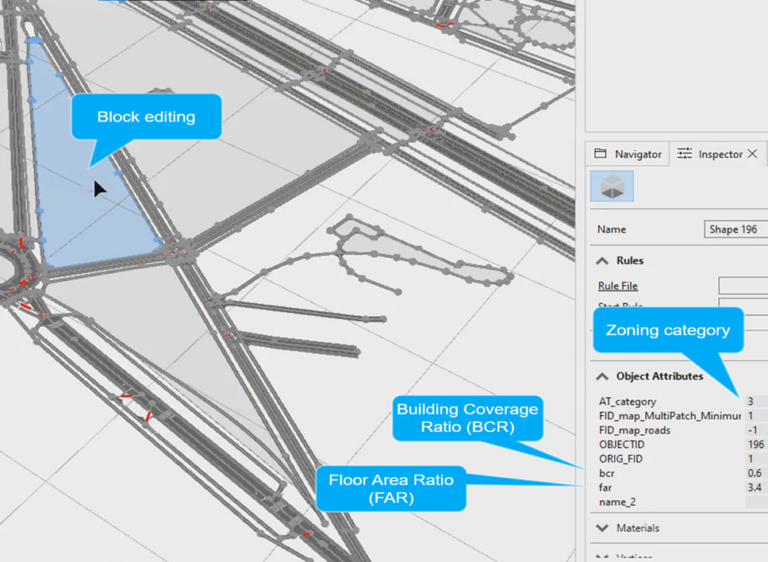 Figure 2. Planner specified block attributes: Zoning (AT_category), Building Coverage Ratio (BCR) and Floor Area Ratio (FAR) densities. The values will determine the size and height of the buildings which will be generated in this block.
