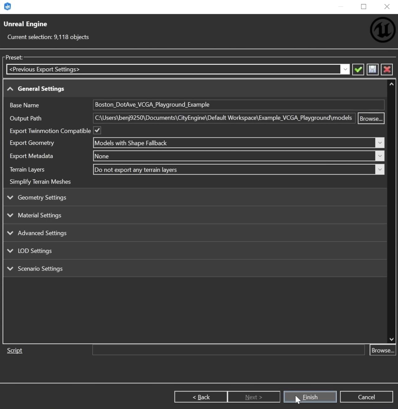 As your CityEngine scene gets bigger and more complex, you will likely repeat the export / import workflow multiple times. To speed up this process, consider splitting up exporting to multiple Datasmith files, for example organized thematically, such as context buildings, vegetation, streets, detail buildings, and so on. Also, please refer to the CityEngine manual on Datasmith export for details on the various export options.