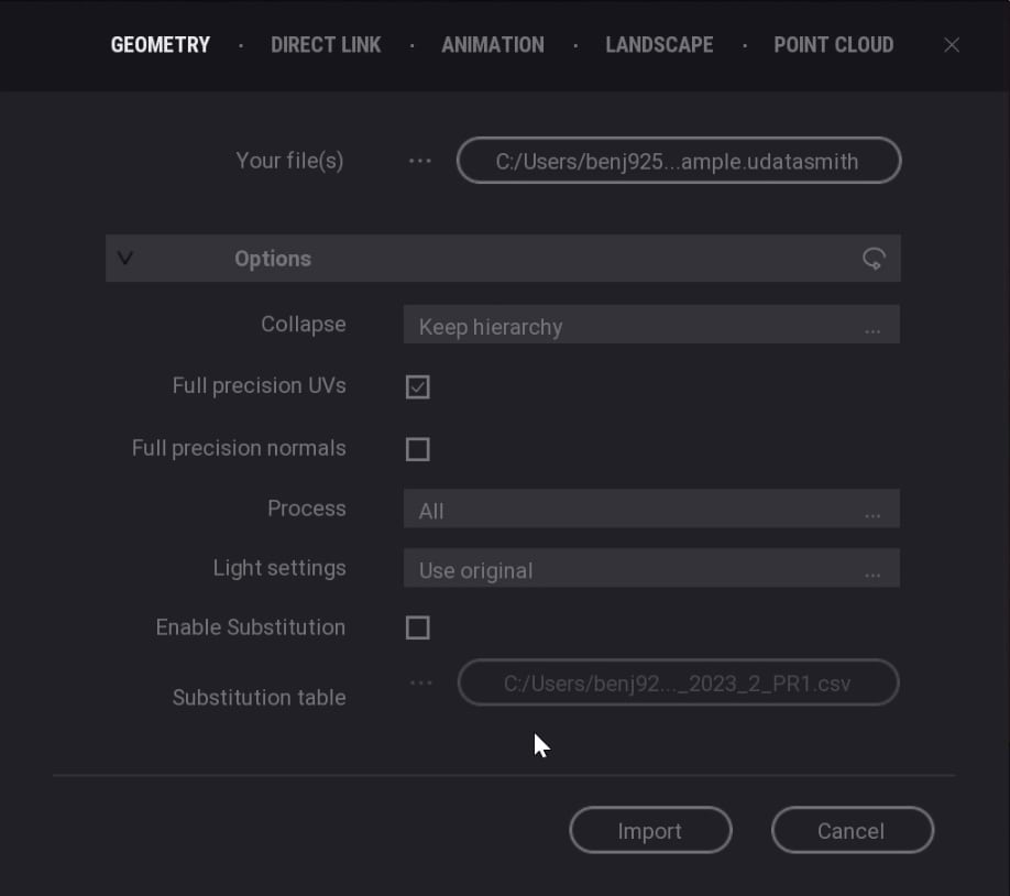 To import the exported CityEngine scene into Twinmotion, open a new (or existing) project in Twinmotion, and chose “Import > Geometry” and select your previously exported Datasmith file. Set all other options as shown in figure 4 and press “Import.” Twinmotion will then import the Datasmith and create the project’s scene graph accordingly.