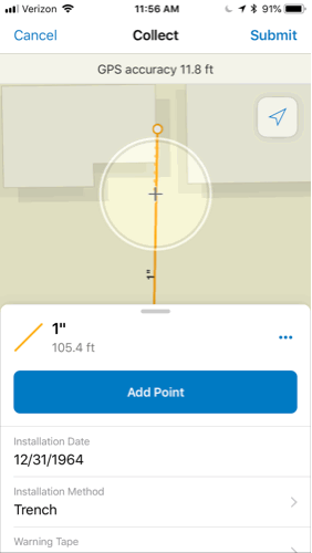 Let’s start off by capturing a barcode for a new gas service line. From within Collector it’s easy to access the barcode scanner and populate any text or numeric field. In our case we’re using a field specifically intended to store the scanned barcode value. This is a really efficient way to accurately capture information about an asset in the field. Once we’ve scanned the barcode, we submit the edit.