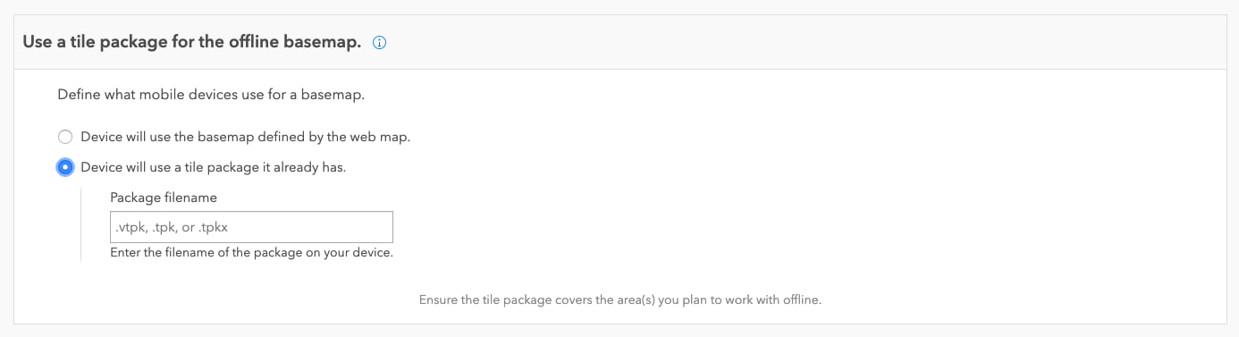 Now you can use a tile package as a basemap instead of the basemap currently in your map. This allows you to download a larger and more detailed basemap for offline use when needed. Collector supports raster tile packages (.tpk), vector tile packages (.vtpk), and now the new, open tile package format introduced with ArcGIS Pro 2.3 (.tpkx). Using a tile package for your offline basemap will dramatically streamline the download experience. Using a tile package can be found in the Advanced Options section of the Offline settings of your map.