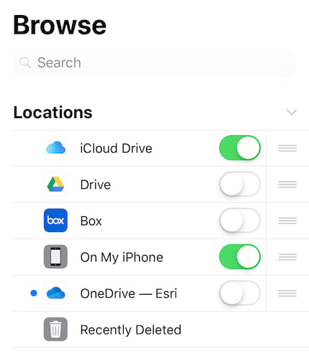 Released with iOS 11, the Files app brings all of your files together. Now it can be used to transport tile packages for use with Collector as well. In the past the only way to transfer tile packages to your iOS device was to tether it to your Windows PC or Mac and use iTunes and copy packages. Now you can sync tile packages from your iCloud drive, from Google drive, Microsoft OneDrive or other cloud services to your iOS device. Then using the Files app, you can download and copy them from their cloud service location and paste them into the Collector folder location on your iPhone or iPad.