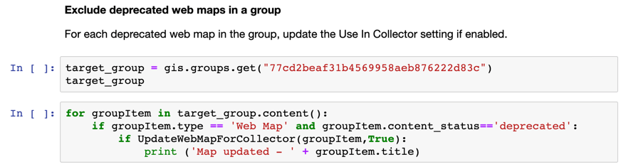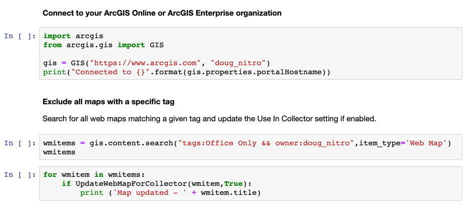 What if we have lots of maps we don’t want to see in Collector? We can use the ArcGIS API for Python to simplify and automate this task for one or more web maps.