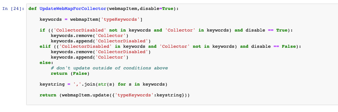 The following Python function takes two parameters: a web map item, and a boolean indicating whether we want to hide or show a given web map in Collector.