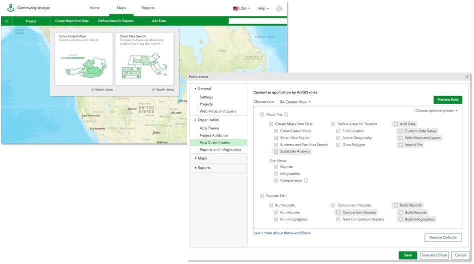 For example, let’s say you have two custom roles in ArcGIS Online. Users in the first custom role are occasional users who primarily view maps, create sites, and run reports in the Community Analyst. Users in the second custom role are power users who create and setup custom data and report templates so others in the organization can use them. To simplify the app experience for the occasional users, the organization’s admin can enable only the mapping, site creation, and report running workflows and hide all other workflows. Similarly, for the power users, the admin can keep all the workflows or enable only the Custom Data Setup and Build workflows for Reports and Infographics and hide Color-coded Maps, Smart Map Search, and Business and Facilities Search.