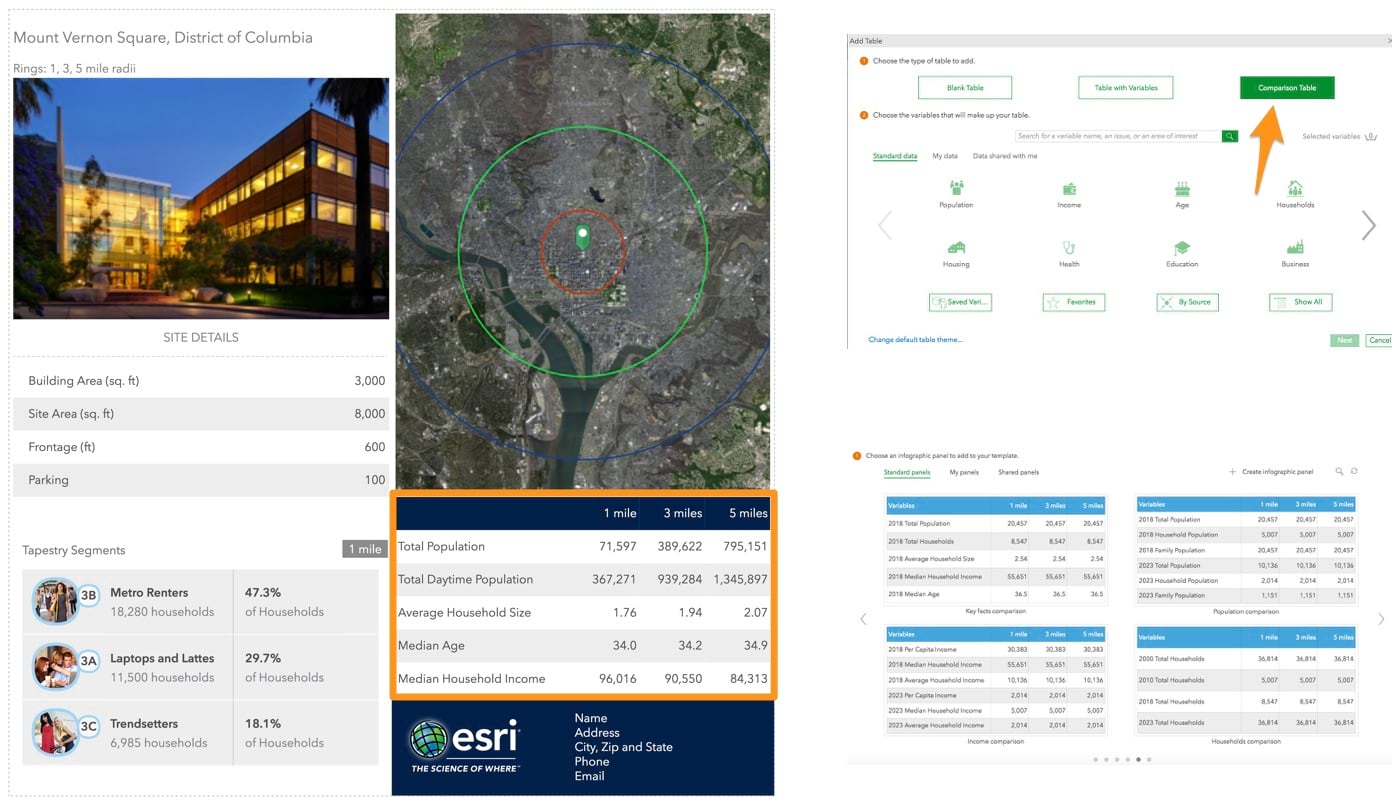 Summarize information for multiple study areas in a single summary table. For example, compare key demographic facts such as population, income, age, and household size for 1, 3, 5-mile rings around a location. Having this information in a summary table also helps you minimize switching between different rings when comparing multiple study areas.