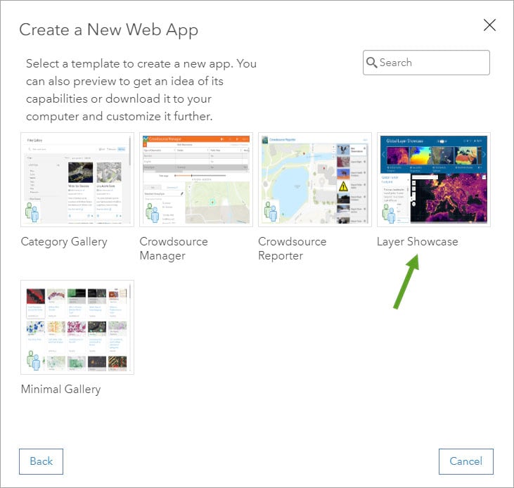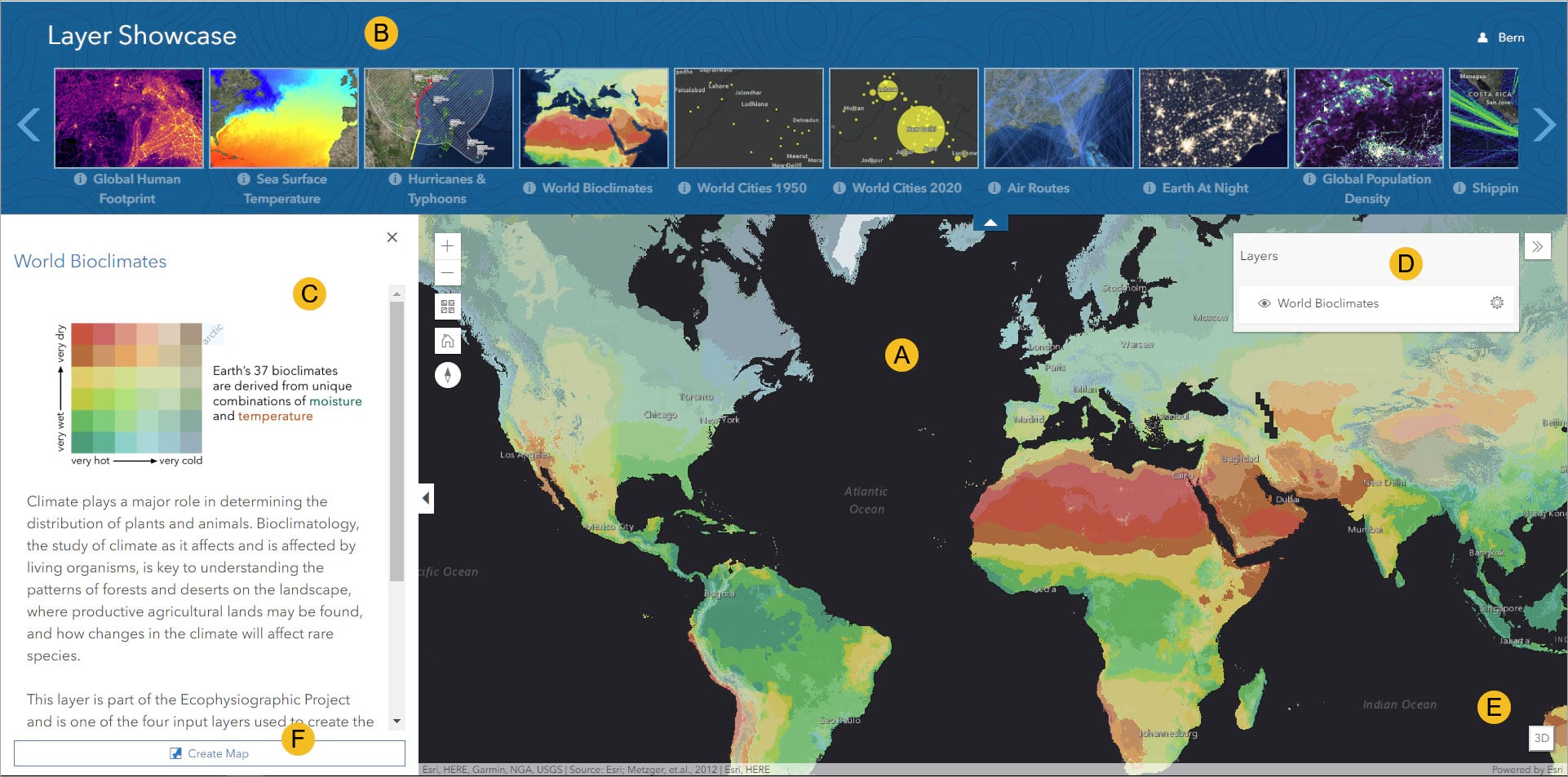 Layer Showcase is a group-based configurable app that allows you to display a gallery of layers found within a group. The layers are displayed in a ribbon, and can be added to a map or globe. This app is handy for allowing viewers to explore layer-based content and optionally create a new map or scene based on the layers that have been added to the view.