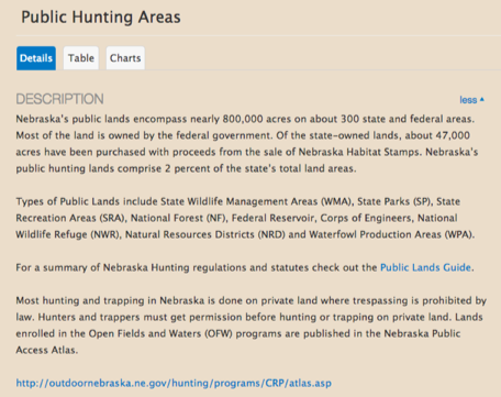With the Commission’s Open Data site, Nebraskans have an interactive way to find information that is truly augmented with the NGPC’s data quality. Nebraskan hunters can discover the Public Hunting Areas dataset, filter out the areas they want, and discover their areas of interest.