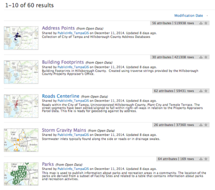 Launching ArcGIS Open Data replaced the need for the City to bundle and compress data and make it available via FTP. Their new site accesses their data from the source and eliminates any need for performing ETL. Tampa has done a great job of preparing their datasets to be discoverable and easy to understand by the community–each item has clear and concise attribute aliases, titles, and descriptions which helps the user quickly find the information they need.
